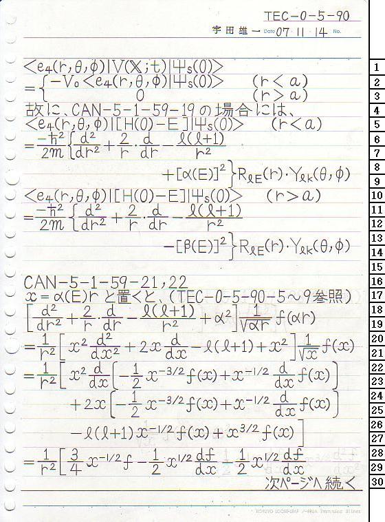 【SEOテキスト】宇田雄一,07.11.14,<e4(r,θ,φ|V(X;t)|Ψs(0)>={-V0<e4(r,θ,φ)|Ψs(0)>(r<a),0(r>a),故に、CAN-5-1-59-19の場合には、<e4(r,θ,φ)|[H(0)-E]|Ψs(0)>(r<a)=-h2/2m{d2/dr2+2/r・d/dr-l(l+1)/r2+[α(E)]2}RlE(r)・Ylk(θ,φ),<e4(r,θ,φ)|[H(0)-E]|Ψs(0)>(r>a)=-h2/2m{d2/dr2+2/r・d/dr-l(l+1)/r2-[β(E)]2}RlE(r)・Ylk(θ,φ),CAN-5-1-59-21,22,x=α(E)rと置くと、(TEC-0-5-90-5〜9参照),[d2/dr2+2/r・d/dr-l(l+1)/r2+α2]1/√αrf(αr)=1/r2[x2d2/dx2+2xd/dx-l(l+1)+x2]1/√xf(x)=1/r2[x2d/dx(-1/2x-3/2f(x)+x-1/2d/dxf(x))+2x(-1/2x-3/2f(x)+x-1/2d/dxf(x))-l(l+1)x-1/2f(x)+x3/2f(x)]=1/r2[3/4x-1/2f-1/2x1/2df/dx-1/2x1/2df/dx,次ページへ続く |