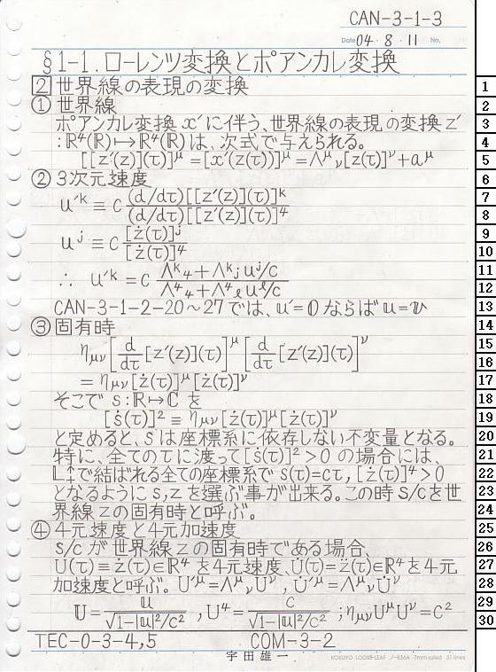 【SEOテキスト】04.8.11,§1-1.ローレンツ変換とポアンカレ変換,[2]世界線の表現の変換,@世界線,ポアンカレ変換x'に伴う、世界線の表現の変換z':R4(R)→R4(R)は、次式で与えられる。,[[z'(z)](τ)]μ=[x'(z(τ))]μ=Λμν[z(τ)]ν+aμ,A3次元速度,u'k≡c(d/dτ)[[z'(z)](τ)]k/(d/dτ)[[z'(z)](τ)]4,uj≡c[,(τ)]j/[,(τ)]4,∴u'k=c,Λk4+Λkjuj/c,/,Λ44+Λ4lul/c,CAN-3-1-2-20〜27では、u'=0ならばu=v,B固有時,ημν[d/dτ,[z'(z)](τ)]μ[d/dτ,[z'(z)](τ)]ν=ημν[,(τ)]μ[,(τ)]ν,そこでs:R→Cを,[,(τ)]2≡ημν[,(τ)]μ[,(τ)]ν,と定めると、sは座標系に依存しない不変量となる。特に、全てのτに渡って[,(τ)]2>0の場合には、L↑+で結ばれる全ての座標系でs(τ)=cτ,[,(τ)]4>0となるようにs,zを選ぶ事が出来る。この時s/cを世界線zの固有時と呼ぶ。,C4元速度と4元加速度,s/cが世界線zの固有時である場合、,U(τ)≡,(τ)∈R4を4元速度、,(τ)=,(τ)∈R4を4元加速度と呼ぶ。U'μ=ΛμνUν,'μ=Λμν,ν,U=u/√,1-|u|2/c2,U4=c/√,1-|u|2/c2;ημνUμUν=c2,宇田雄一 |