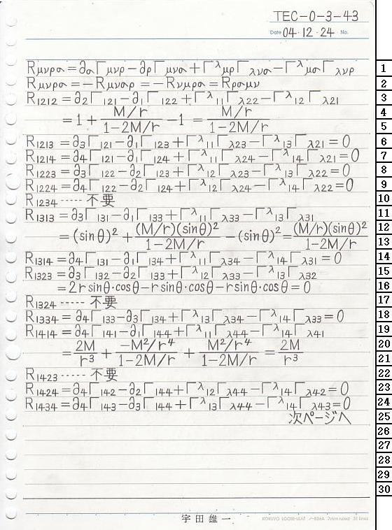 【SEOテキスト】04.12.24,Rμνρσ=∂σΓμνρ-∂ρΓμνσ+ΓλμρΓλνσ-ΓλμσΓλνρ,Rμνρσ=-Rμνσρ=-Rνμρσ=Rρσμν,R1212=∂2Γ121-∂1Γ122+Γλ11Γλ22-Γλ12Γλ21=1+M/r/1-2M/r-1=M/r/1-2M/r,R1213=∂3Γ121-∂1Γ123+Γλ11Γλ23-Γλ13Γλ21=0,R1214=∂4Γ121-∂1Γ124+Γλ11Γλ24-Γλ14Γλ21=0,R1223=∂3Γ122-∂2Γ123+Γλ12Γλ23-Γλ13Γλ22=0,R1224=∂4Γ122-∂2Γ124+Γλ12Γλ24-Γλ14Γλ22=0,R1234・・・・・不要R1313=∂3Γ131-∂1Γ133+Γλ11Γλ33-Γλ13Γλ31=(sinθ)2+(M/r)(sinθ)2/1-2M/r-(sinθ)2=(M/r)(sinθ)2/1-2M/r,R1314=∂4Γ131-∂1Γ134+Γλ11Γλ34-Γλ14Γλ31=0,R1323=∂3Γ132-∂2Γ133+Γλ12Γλ33-Γλ13Γλ32=2rsinθ・cosθ-rsinθ・cosθ-rsinθ・cosθ=0,R1324・・・・・不要R1334=∂4Γ133-∂3Γ134+Γλ13Γλ34-Γλ14Γλ33=0,R1414=∂4Γ141-∂1Γ144+Γλ11Γλ44-Γλ14Γλ41=2M/r3+-M2/r4/1-2M/r+M2/r4/1-2M/r=2M/r3,R1423・・・・・不要R1424=∂4Γ142-∂2Γ144+Γλ12Γλ44-Γλ14Γλ42=0,R1434=∂4Γ143-∂3Γ144+Γλ13Γλ44-Γλ14Γλ43=0次ページへ,宇田雄一 |