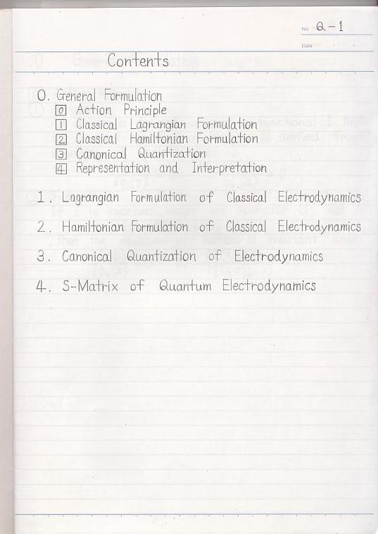 ySEOtextzContents, 0. General Formulation [0] Action Principle [1] Classical Lagrangian Formulation [2] Classical Hamiltonian Formulation [3] Canonical Quantization [4] Representation and Interpretation, 1. Lagrangian Formulation of Classical Electrodynamics, 2. Hamiltonian Formulation of Classical Electrodynamics, 3. Canonical Quantization of Electrodynamics, 4. S-Matrix of Quantum Electrodynamics |